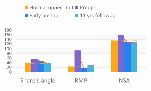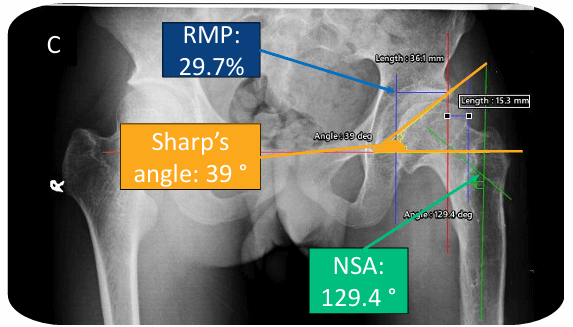 Fig. 2: Radiographic measurements (RMP: Reimer’s Migration Percentage; NSA: Neck Shaft Angle)