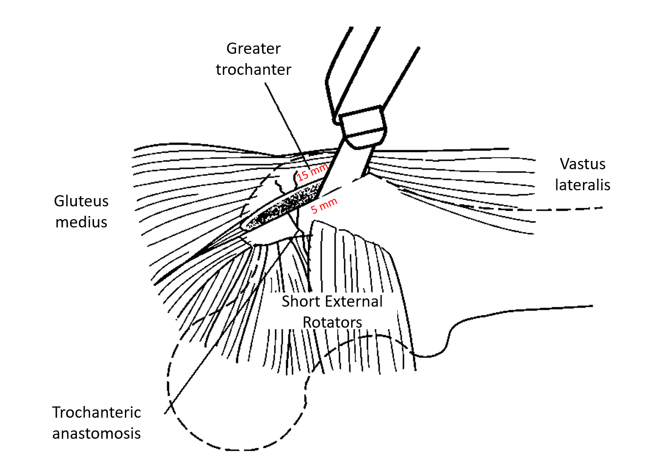 - Osteotomy: Maximal 1.5 cm thick, exits just anterior to posterior-most gluteus medius insertion.