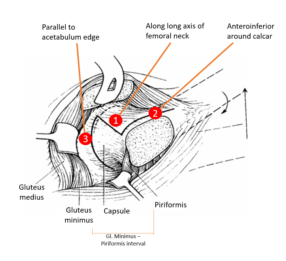 - Inferior border of gluteus minimus is separated from underlying capsule and piriformis (minimus-piriformis interval i.e. gluteus minimus is retracted anteriorly and superiorly; piriformis in retracted inferiorly).